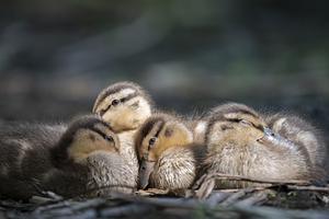 Four Mallard ducklings nap in the sun.